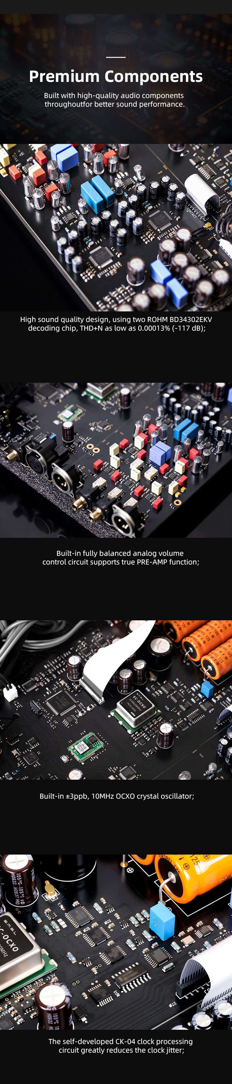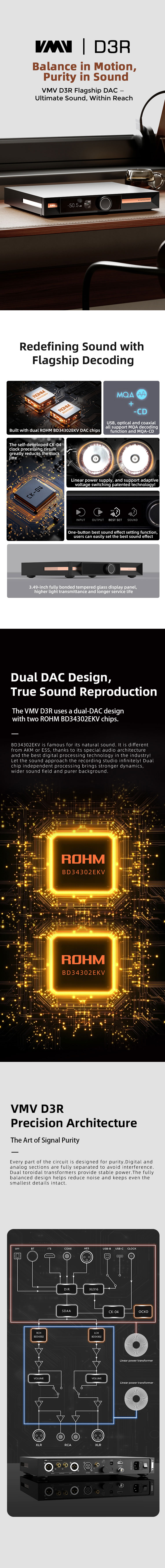 High sound quality design, using two ROHM BD34302EKV decoding chip,THD+N as low as 0.00013% (-117 dB);