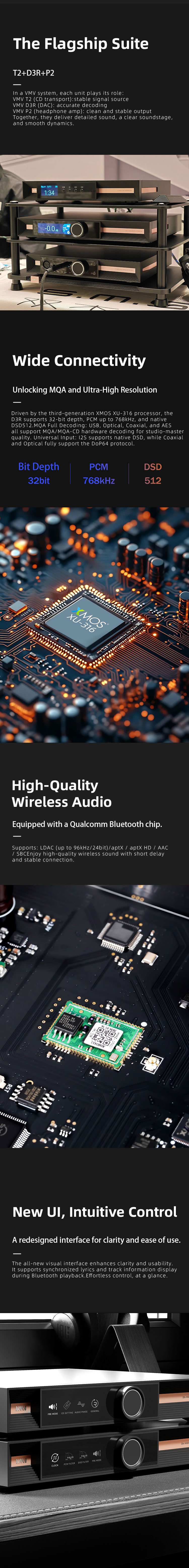 uSB and PS support Native DSD input, and coaxial and optical support DOP64;XMOS xU-316,32-bit USB solution, supports DoPand native DSD,PCM supports up to 768kHz, and DSD supports DSD512;